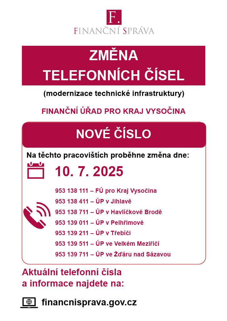 [ARCHIV] FINANČNÍ ÚŘAD PRO KRAJ VYSOČINA - Nová telefonní číslaPlatné od 07.07.2025 do 31.12.2025 ![]() |